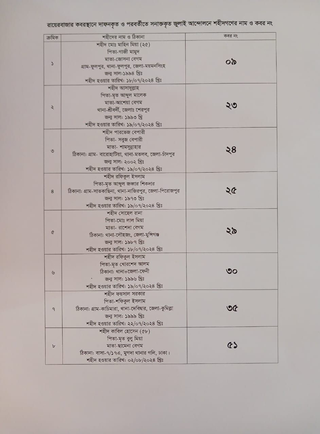 রায়েরবাজার কবরস্থানে জুলাই অভ্যুত্থানের সময় বেওয়ারিশ হিসেবে দাফন করা ১১৪ জনের মধ্যে ৮ জনের পরিচয় শনাক্ত করা হয়েছে। শিক্ষা উপদেষ্টা আদিলুর রহমান খান এই তথ্য সরকারি পক্ষ থেকে প্রকাশ করেছেন।